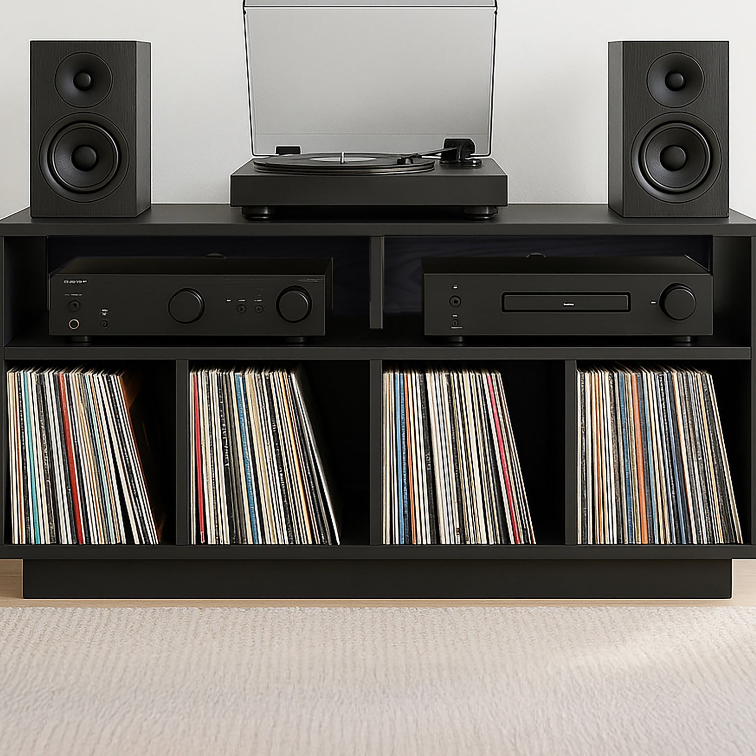 Organize your prized vinyl collection with four spacious record storage compartments, purpose-built for easy access and visual appeal. Display and store LPs the right way—upright, safe, and stylish.
