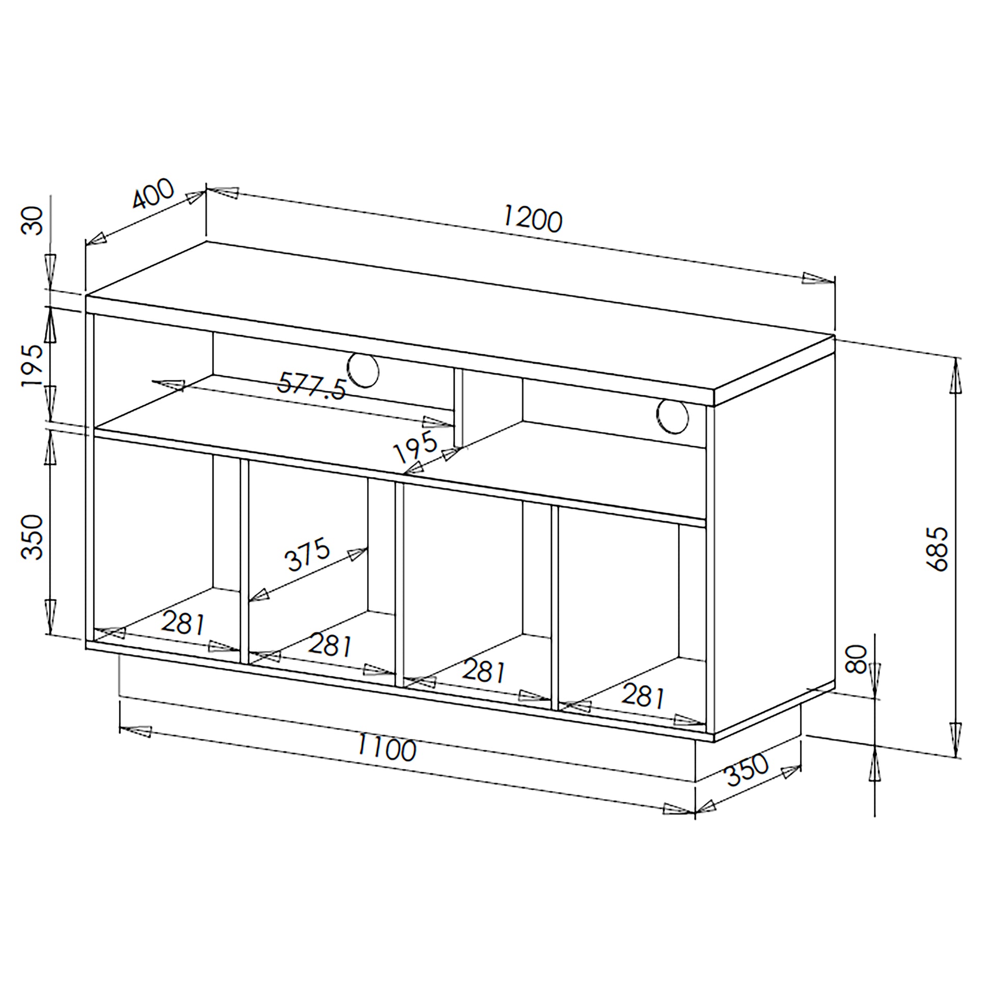 The two open component shelves provide ample space for amplifiers, CD players, or sound bars, while four dedicated vinyl storage compartments keep your records organized and easily accessible. A sturdy wooden plinth base and wide 1200mm bench top make it ideal for turntables and audio equipment. Whether you're setting up a Hi-Fi system, building a vinyl listening corner, or simply elevating your home entertainment setup, the EDISON1200BO offers both form and function.