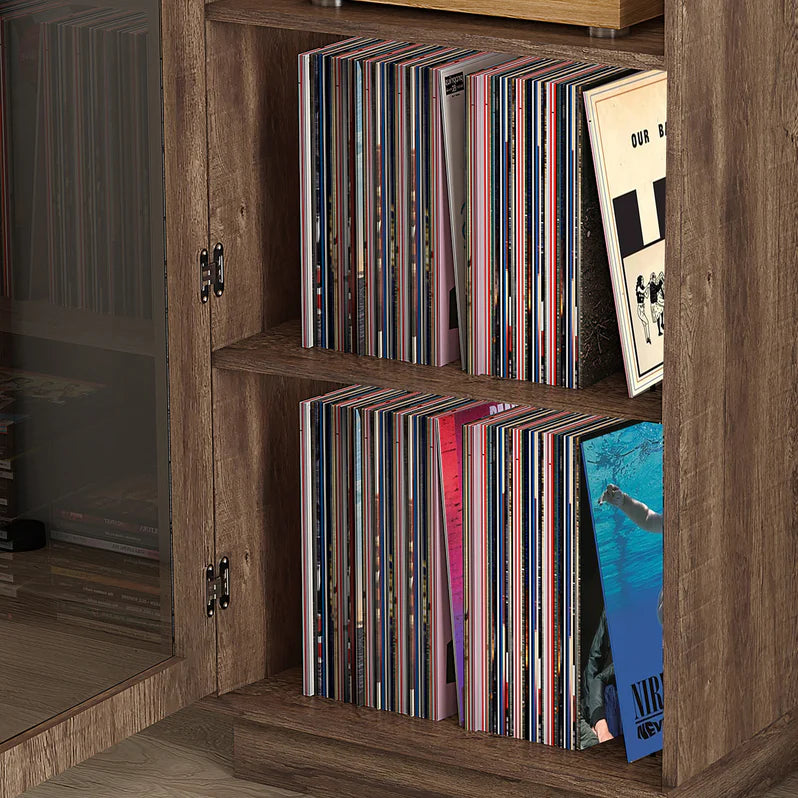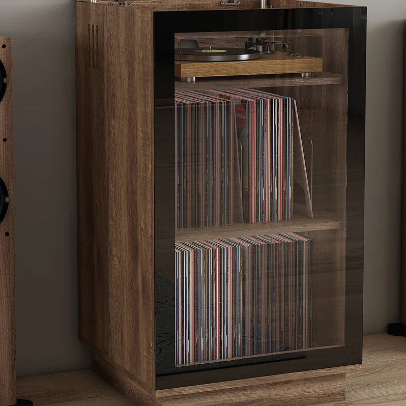 With its Full Cabinet Size Glass Door, made of safety Tempered Glass. The Hollywood HiFi Cabinet keeps your Valuable Record Collection Safe from prying eyes or inquisitive little hands. Featuring an IR friendly black glass film coating and black outer frame, your remotes will still operate your turntable and HiFi equipment even when the door is closed.