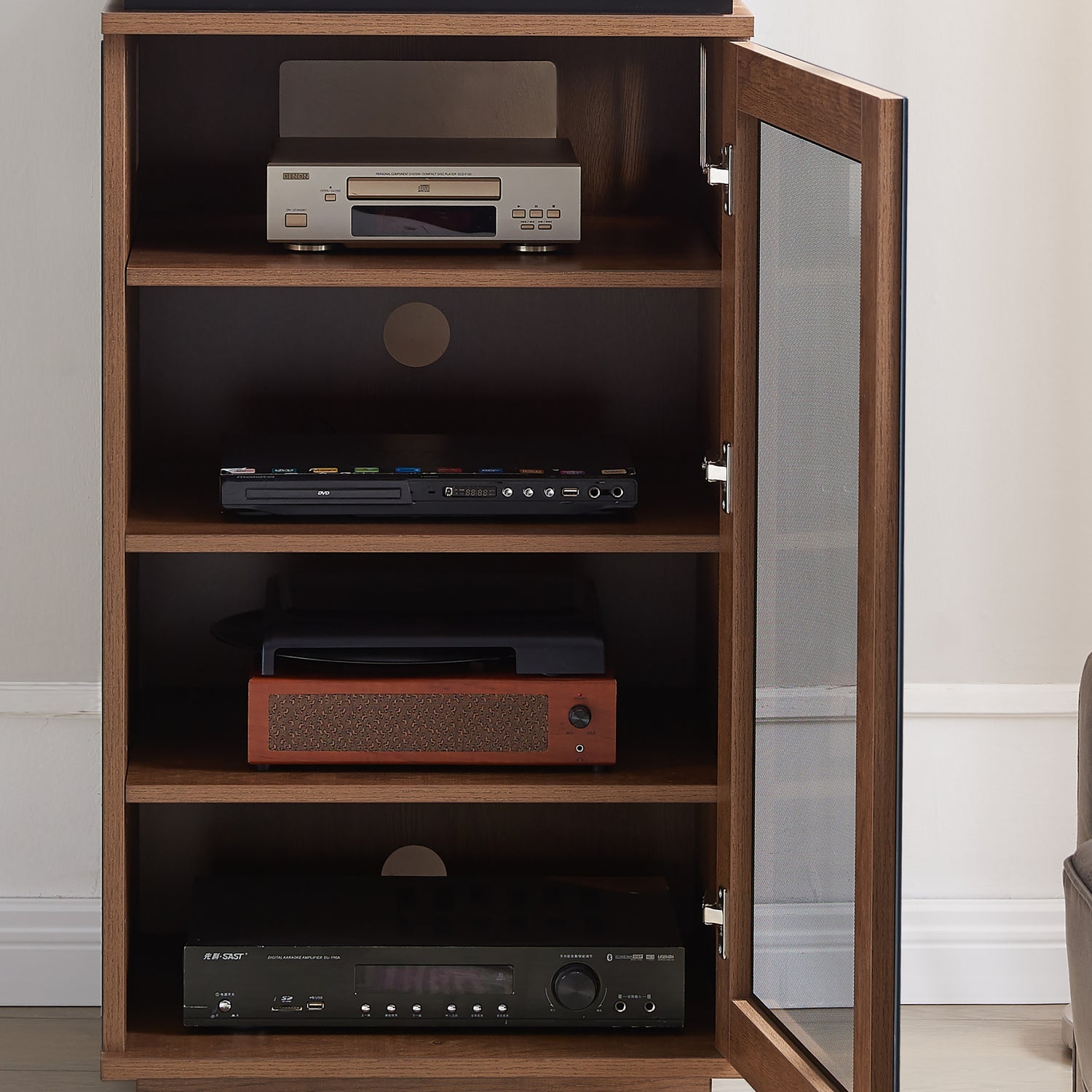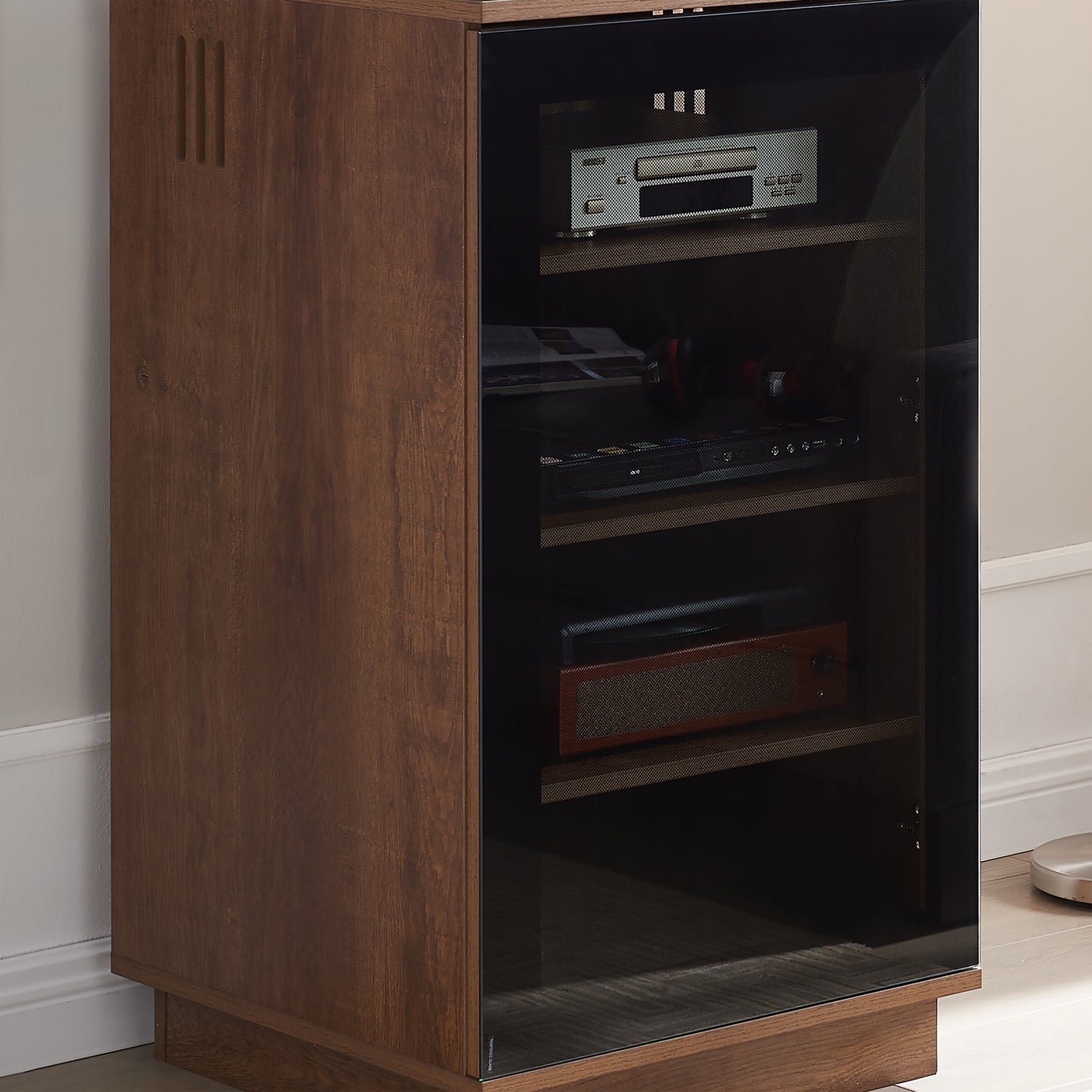 Built for the HiFi Enthusiasts and Audiophiles alike. This Hi Fi Cabinet has lots of features built in to ensure your Home Audio Equipment is stored and kept in optimum condition. To help prevent overheating of your components being in side this enclosed cabinet, the Hi Fi Cabinet comes with heat ventilation channels on both sides and several cable management holes on the rear. All positioned to assist with heat dissipation.